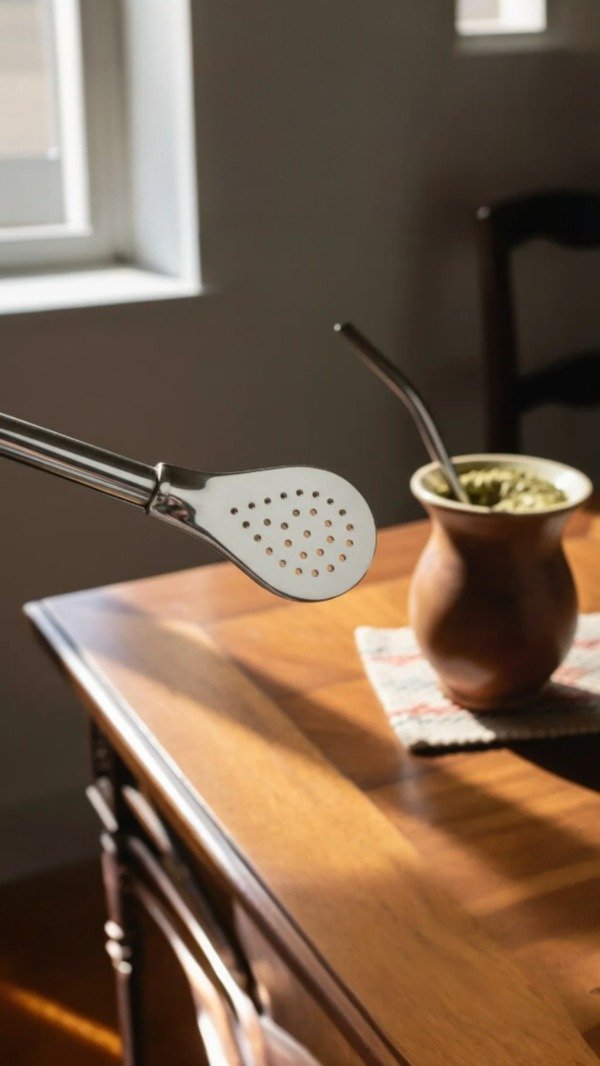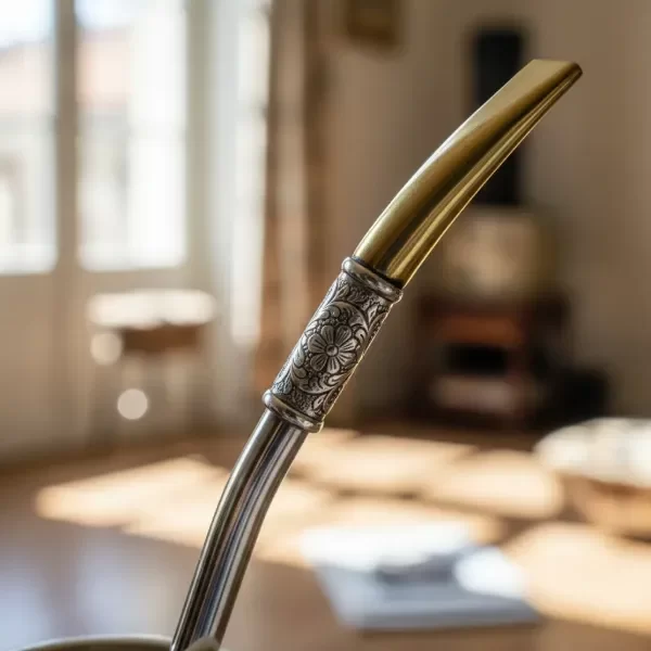 Su diseño combina practicidad y estética, ofreciendo un agarre cómodo y una boquilla resistente. El pico de bronce asegura durabilidad y un toque tradicional, mientras que el filtro garantiza una óptima circulación sin obstrucciones. Ideal para quienes buscan un accesorio elegante y funcional para disfrutar del mate.