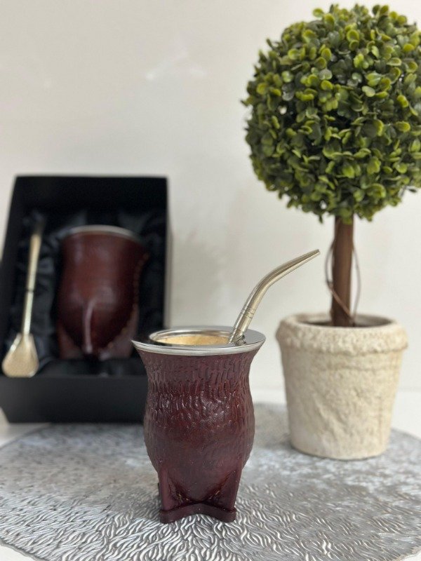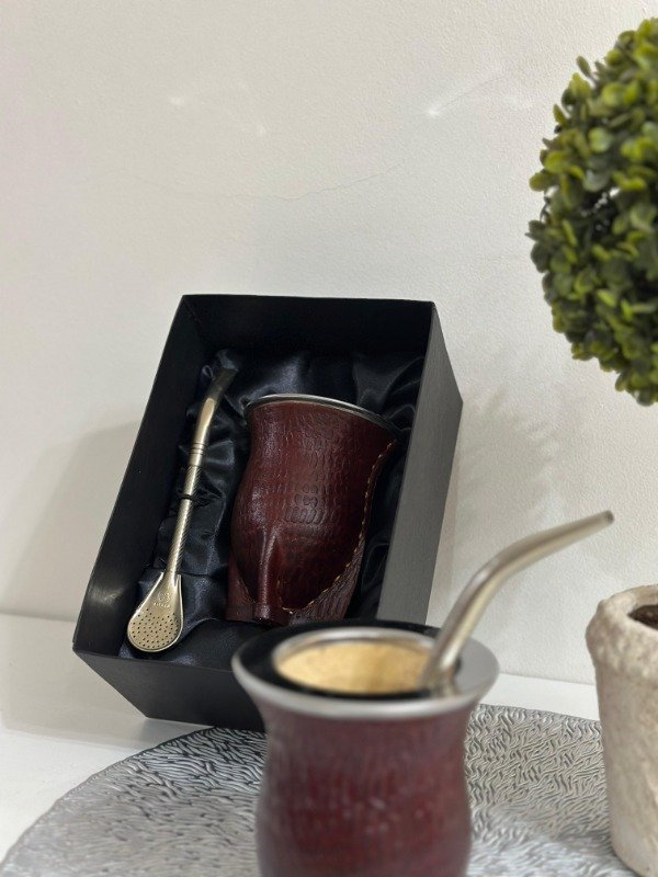 Un mate con presencia y estilo propio. Su diseño tipo camionero, forrado en cuero croco color borravino, lo convierte en un clásico moderno que no pasa desapercibido. Ideal para quienes buscan personalidad y carácter en cada mate.
