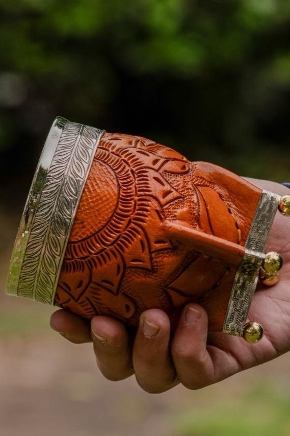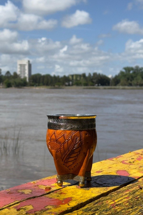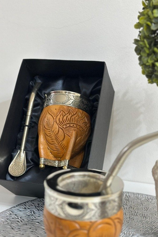 Elegancia y tradición se combinan en este mate imperial artesanal, revestido en cuero repujado en un cálido color suela. Perfecto para quienes valoran el diseño exclusivo y la durabilidad. Ideal para compartir momentos únicos con estilo y comodidad.