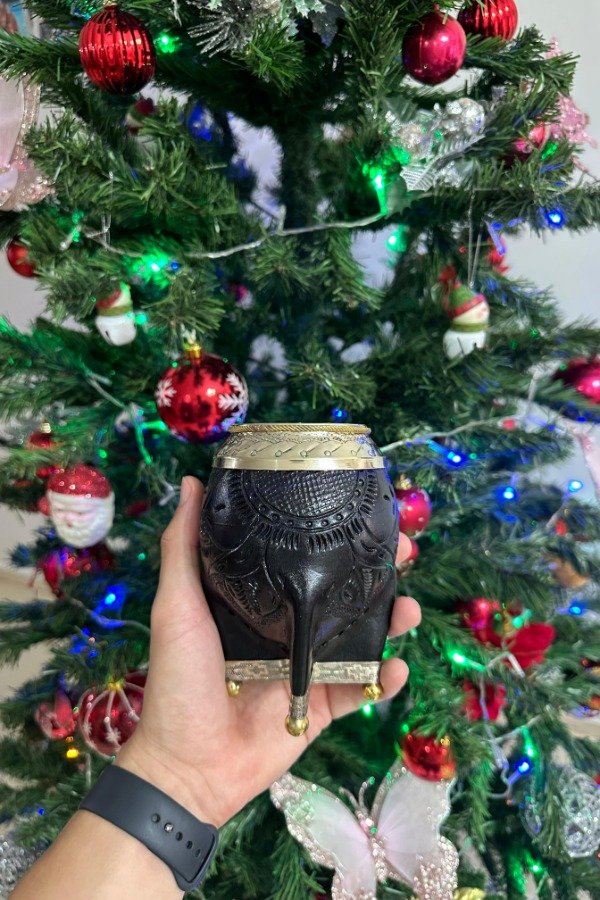 Con forma torpedo, está forrado en cuero repujado color Negro, lo que le da un estilo único y distinguido. Ideal para quienes valoran los detalles y disfrutan de un buen mate.