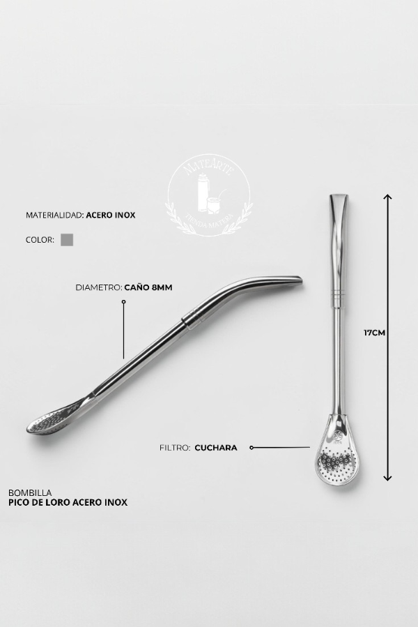 Bombilla para mate fabricada en acero inoxidable, resistente y duradera. Su diseño pico de loro brinda una toma cómoda y un flujo de mate suave.