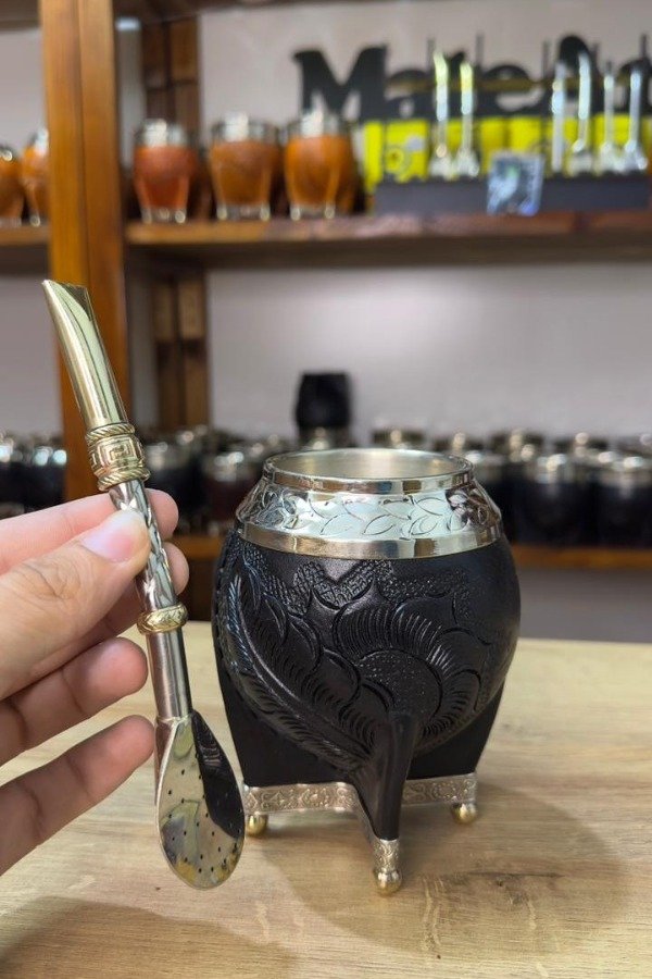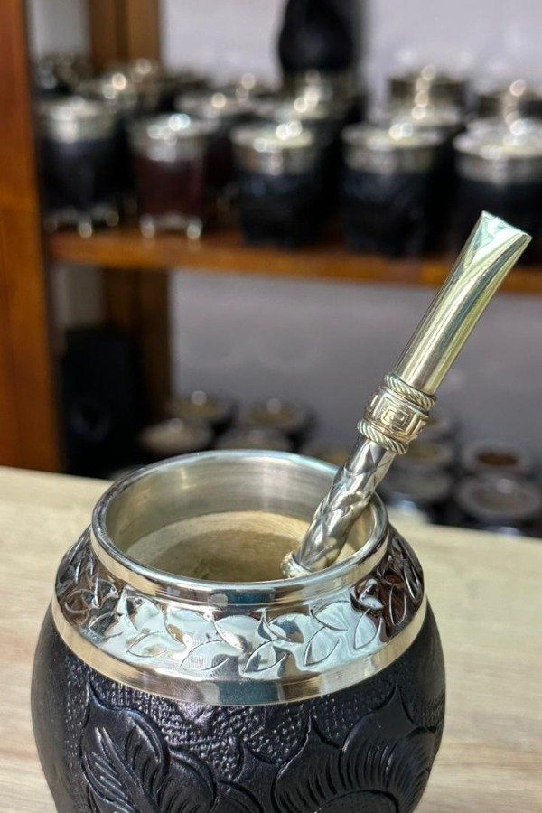 Un combo pensado para quienes disfrutan del mate con estilo y personalidad. El mate torpedo repujado en color negro combina un diseño clásico con detalles artesanales que lo hacen único, ideal para uso diario o para regalar. Incluye un bombillón de alpaca resistente y duradero, con dijes decorativos que le aportan un toque distintivo y elegante.