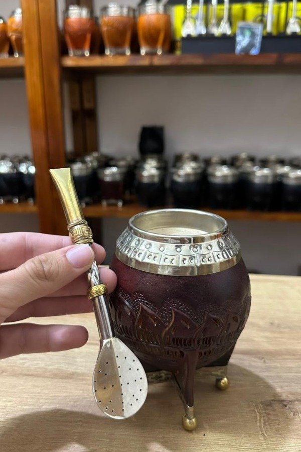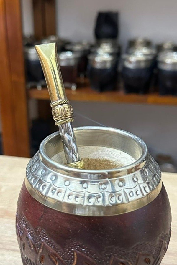 Un combo pensado para quienes disfrutan del mate con estilo y personalidad. El mate torpedo repujado en color Borravino combina un diseño clásico con detalles artesanales que lo hacen único, ideal para uso diario o para regalar. Incluye un bombillón de alpaca resistente y duradero, con dijes decorativos que le aportan un toque distintivo y elegante.